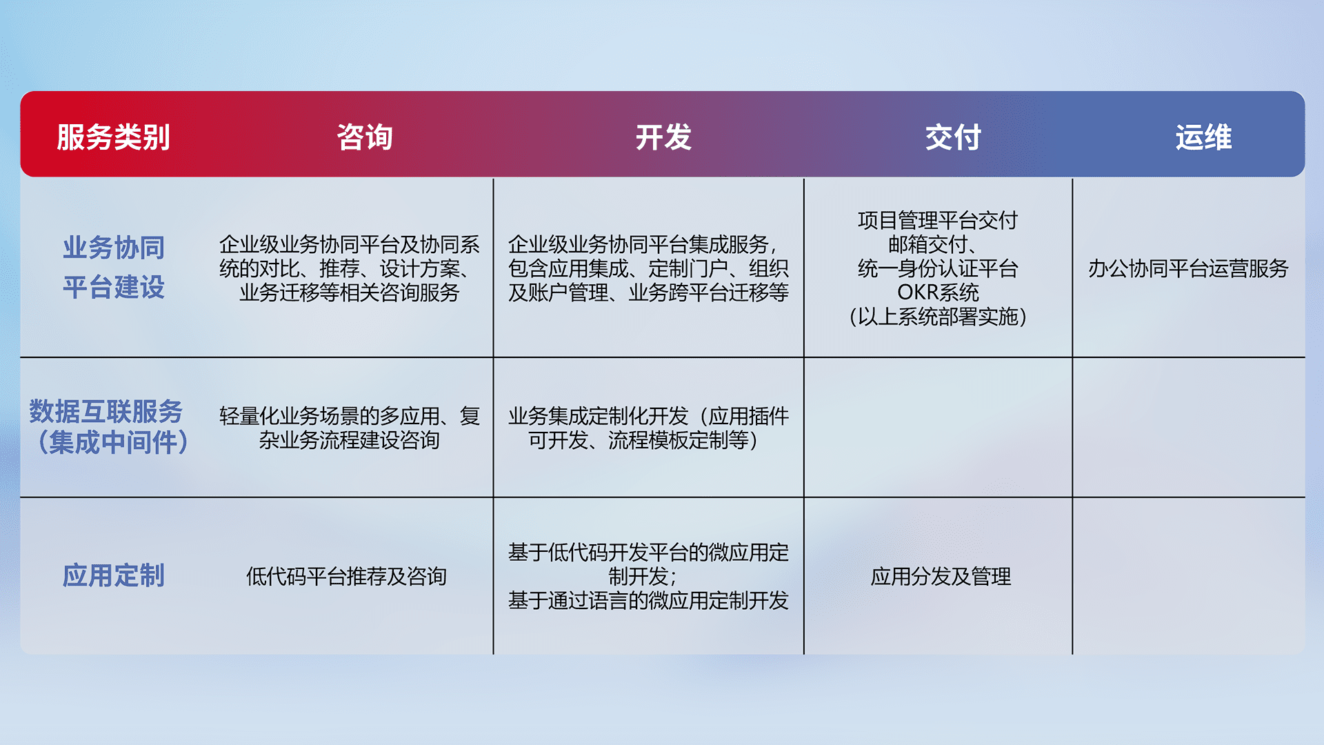 针对钉钉、、、企微、、IDaas等平台级产品提供产品的规划、、、、方案、、、、交付、、、定制化开发等服务,,,,实现如统一协同办公、、、、智能客户服务、、、混合会议管理、、、智能数据查询、、、、等业务场景,,,实现数字化转型。。。